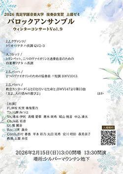 2022年3月2日(水)発売CDのお知らせ NieR Replicant Choir Arrangement Album 5曲演奏しております! 1月10日(土) 上薗ゼミ ニューイヤーコンサートVol.9 >詳細へ 2月15日(日) 上薗ゼミ ウィンターコンサートVol.9 >詳細へ 2月23日(月祝) 第1回 美浜バロックコンサート「花咲くバロック」 >詳細へ 3月1日(日) 第22回 上薗門下 チェンバロ発表会 >詳細へ 5月8日(金)〜10日(日) 第20回 丹沢アートフェスティヴァル 5月14日(木) 鶴見de古楽 エール・ド・クールが紡ぐフランスの歌心 5月30日(土) 千元屋コンサート「時を超える響き Vol.2」 10月11日(日) 第20回秦野バロック・コンサート・シリーズ 11月21日(土) 声楽アンサンブjル オラトリオ定期演奏会